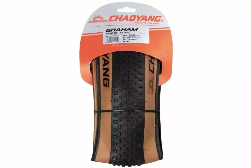 La cubierta Chaoyang Graham TLR de 29″ es muy rodadora, con un taco poco agresivo.