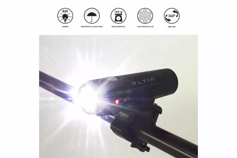 El faro delantero recargable de eltin cuenta con una potencia de 850 lúmenes. Es una luz resistente al agua (IPX-6) y con rotación 360º sobre el soporte. Cuenta con luces laterales que aportan mayor visibilidad. Perfecto para quien busca gran luminosidad en las salidas nocturnas este faro cuenta con cuatro modos y duraciones
