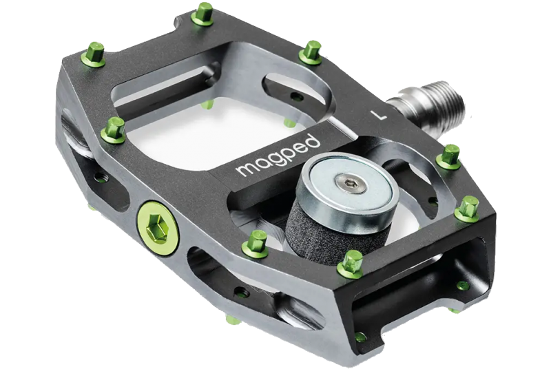 Los Magped Enduro son la última idea en pedales de plataforma para Gravel, DH, BTT, e-bikes. En esta versión, respecto a la Sport2, su plataforma es de una sola pieza mecanizada CNC, esto los convierte en más resistentes, su eje también está reforzado y tiene 2 pins más que por cada cara. Con el sistema magnético patentado es posible sacar el pie de forma rápida y fácil en cualquier situación. El riesgo de caídas y de lesiones se reduce al mínimo en comparación con los pedales automáticos con calas fijas. La placa de acero se puede montar en cualquier zapatilla preparada para montar calas en pocos minutos. A diferencia de otros sistemas, la suciedad no es un problema para el anclado y también en mucho más cómodo para caminar, ya que la placa es plana y no molesta. Una de las múltiples cualidades de este pedal es la posibilidad de rotación del pie, que te permite libremente tomar la angulación necesaria que necesites en cada apoyo y tu paso por curva será más preciso.